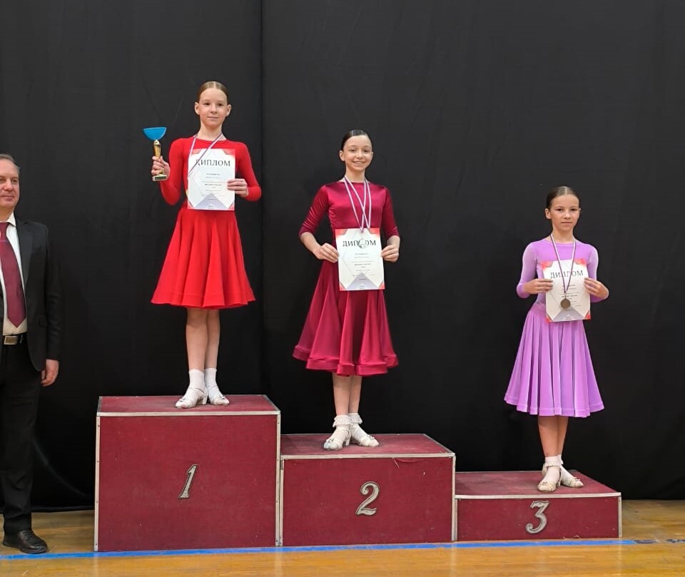 Катя заняла 4 место в латине и два раза 2 место в стандарте в группе дети 2 открытый класс и в группе дети 2+1 открытый класс. Очень достойный результат!